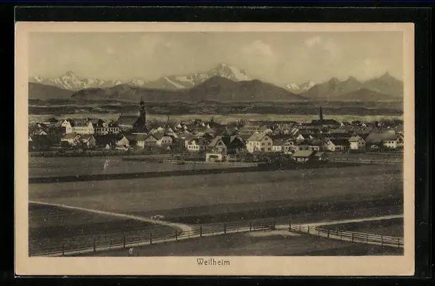 AK Weilheim, Gesamtansicht mit Bergpanorama