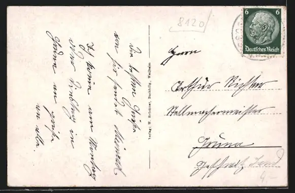 Personenbezogene Daten auf der Rückseite der Karte wurden durch blauen Textmarker unkenntlich gemacht. Die blauen Stellen sind auf die Vorderseite durchgeweicht und wirken sich negativ auf das Postkartenfoto aus
