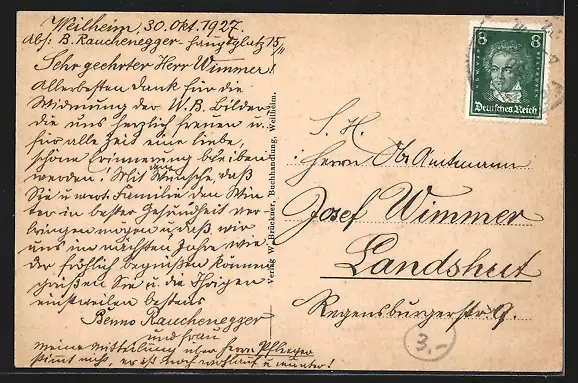 Personenbezogene Daten auf der Rückseite der Karte wurden durch blauen Textmarker unkenntlich gemacht. Die blauen Stellen sind auf die Vorderseite durchgeweicht und wirken sich negativ auf das Postkartenfoto aus