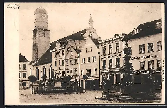AK Weilheim / Obb., Strassenpartie am Hauptplatz mit Geschäft Wilhelm Fleischmann