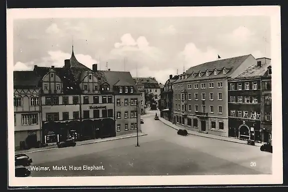 AK Weimar, Markt mit Haus Elephant und Geschäften
