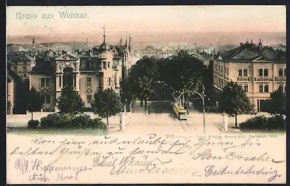 AK Weimar, Ortsansicht mit Strassenbahn, Hotel Kaiserin Auguste