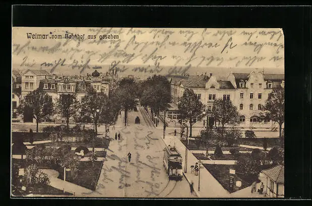 AK Weimar, Ortsansicht vom Bahnhof aus, mit Strassenbahn
