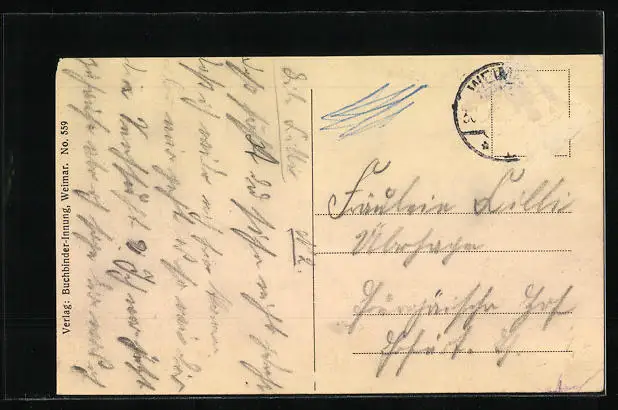 Personenbezogene Daten auf der Rückseite der Karte wurden durch blauen Textmarker unkenntlich gemacht. Die blauen Stellen sind auf die Vorderseite durchgeweicht und wirken sich negativ auf das Postkartenfoto aus