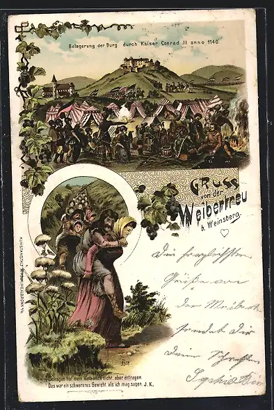 AK Weinsberg, Belagerung der Burg durch Kaiser Conrad, 1140, Frau trägt Mann, Weintrauben