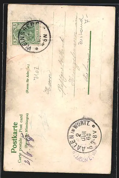 Personenbezogene Daten auf der Rückseite der Karte wurden durch blauen Textmarker unkenntlich gemacht. Die blauen Stellen sind auf die Vorderseite durchgeweicht und wirken sich negativ auf das Postkartenfoto aus