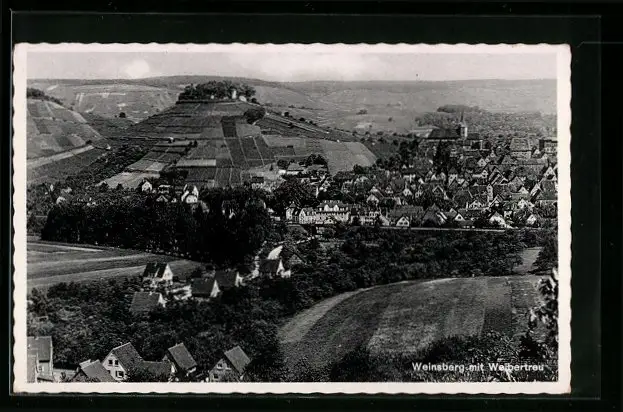 AK Weinsberg a. d. Weibertreu, Stadttotale mit der Burgruine über der Stadt