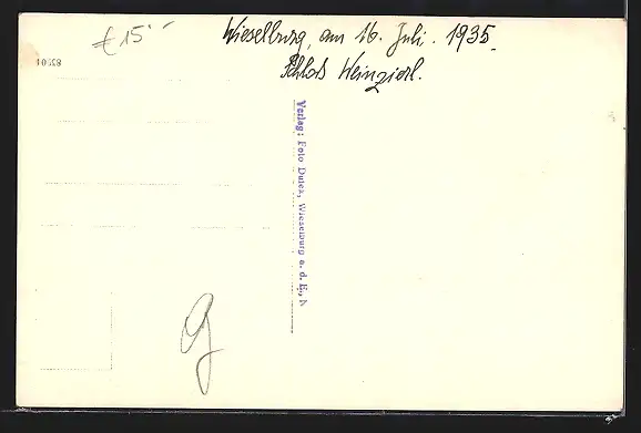 Personenbezogene Daten auf der Rückseite der Karte wurden durch blauen Textmarker unkenntlich gemacht. Die blauen Stellen sind auf die Vorderseite durchgeweicht und wirken sich negativ auf das Postkartenfoto aus