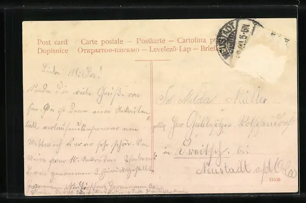Personenbezogene Daten auf der Rückseite der Karte wurden durch blauen Textmarker unkenntlich gemacht. Die blauen Stellen sind auf die Vorderseite durchgeweicht und wirken sich negativ auf das Postkartenfoto aus