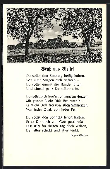 AK Weisel / Rhein, Blick zur Kirche im Ort, Heimat-Gedicht