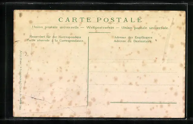 Personenbezogene Daten auf der Rückseite der Karte wurden durch blauen Textmarker unkenntlich gemacht. Die blauen Stellen sind auf die Vorderseite durchgeweicht und wirken sich negativ auf das Postkartenfoto aus