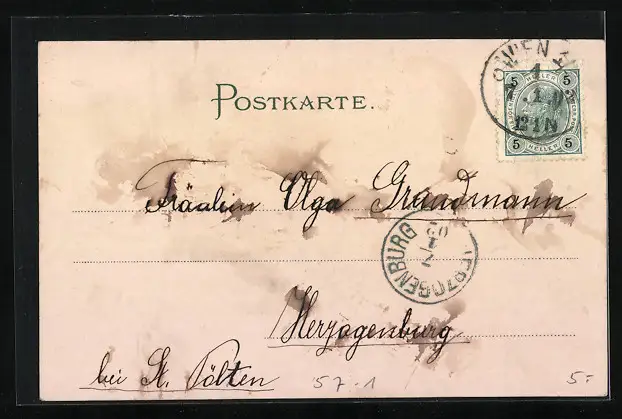 Personenbezogene Daten auf der Rückseite der Karte wurden durch blauen Textmarker unkenntlich gemacht. Die blauen Stellen sind auf die Vorderseite durchgeweicht und wirken sich negativ auf das Postkartenfoto aus