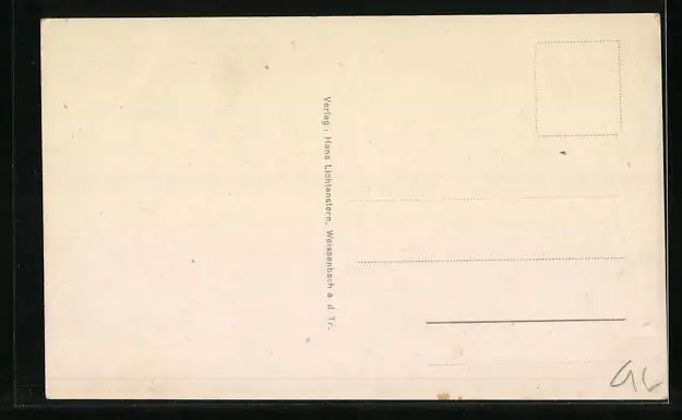 Personenbezogene Daten auf der Rückseite der Karte wurden durch blauen Textmarker unkenntlich gemacht. Die blauen Stellen sind auf die Vorderseite durchgeweicht und wirken sich negativ auf das Postkartenfoto aus