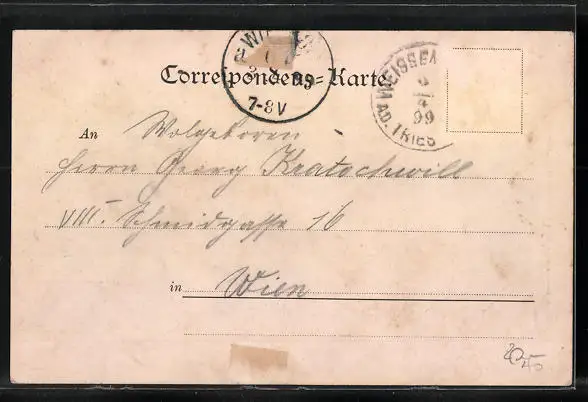 alte Ansichtskarte, gelaufen 1899, Briefmarke entfernt, rückseitig Oberflächenschaden, rückseitig Klebe- und Papierreste, guter Zustand