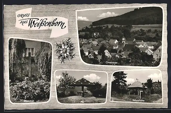 AK Weissenborn / Eschwege, Ehrenmal, Pilz, Schutzhütte, Ortsansicht