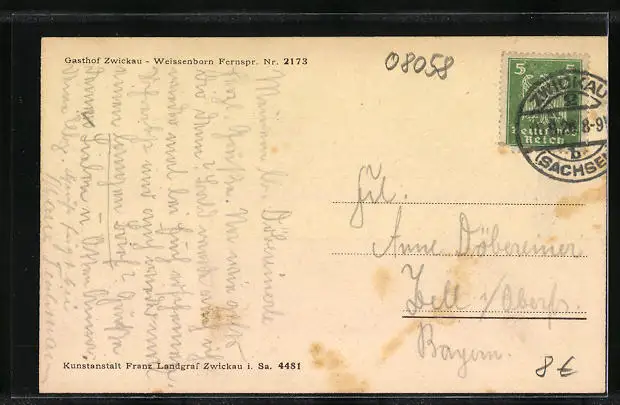 Personenbezogene Daten auf der Rückseite der Karte wurden durch blauen Textmarker unkenntlich gemacht. Die blauen Stellen sind auf die Vorderseite durchgeweicht und wirken sich negativ auf das Postkartenfoto aus