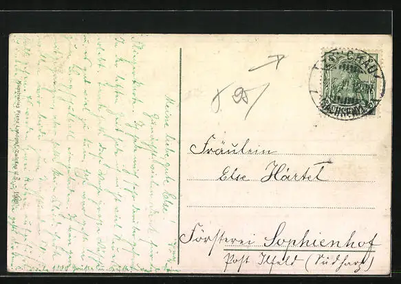 Personenbezogene Daten auf der Rückseite der Karte wurden durch blauen Textmarker unkenntlich gemacht. Die blauen Stellen sind auf die Vorderseite durchgeweicht und wirken sich negativ auf das Postkartenfoto aus