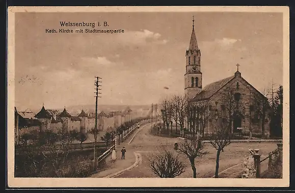 AK Weissenburg i. B., Kath. Kirche mit Stadtmauerpartie