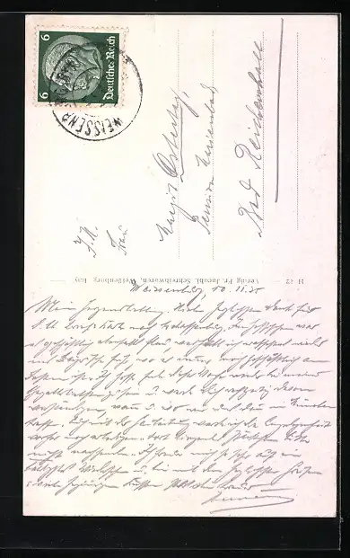 Personenbezogene Daten auf der Rückseite der Karte wurden durch blauen Textmarker unkenntlich gemacht. Die blauen Stellen sind auf die Vorderseite durchgeweicht und wirken sich negativ auf das Postkartenfoto aus