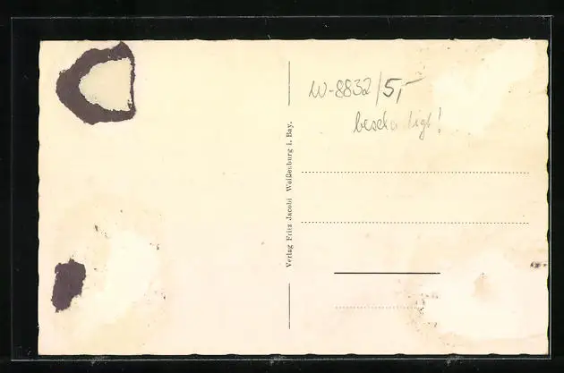 Personenbezogene Daten auf der Rückseite der Karte wurden durch blauen Textmarker unkenntlich gemacht. Die blauen Stellen sind auf die Vorderseite durchgeweicht und wirken sich negativ auf das Postkartenfoto aus