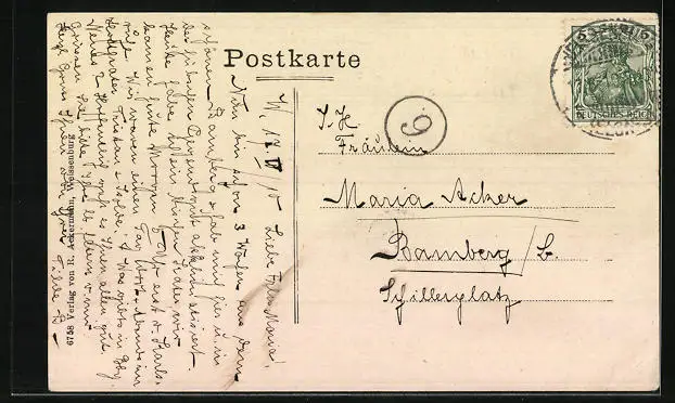 Personenbezogene Daten auf der Rückseite der Karte wurden durch blauen Textmarker unkenntlich gemacht. Die blauen Stellen sind auf die Vorderseite durchgeweicht und wirken sich negativ auf das Postkartenfoto aus