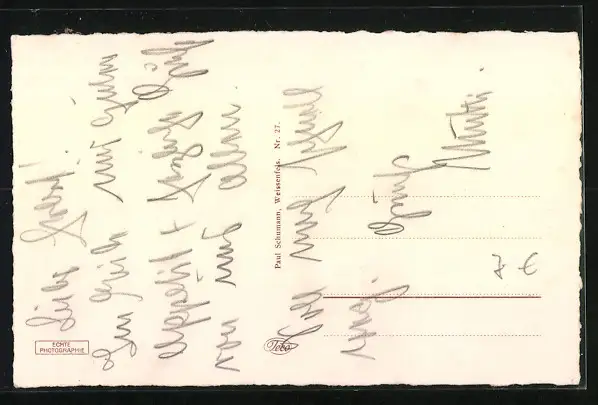 Personenbezogene Daten auf der Rückseite der Karte wurden durch blauen Textmarker unkenntlich gemacht. Die blauen Stellen sind auf die Vorderseite durchgeweicht und wirken sich negativ auf das Postkartenfoto aus