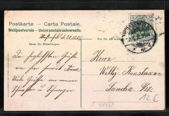 alte Ansichtskarte, gelaufen 1908, Stempelspur, guter Zustand