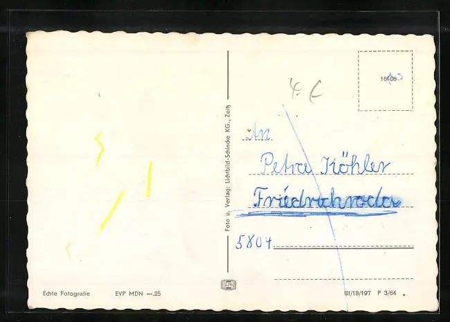 Personenbezogene Daten auf der Rückseite der Karte wurden durch blauen Textmarker unkenntlich gemacht. Die blauen Stellen sind auf die Vorderseite durchgeweicht und wirken sich negativ auf das Postkartenfoto aus