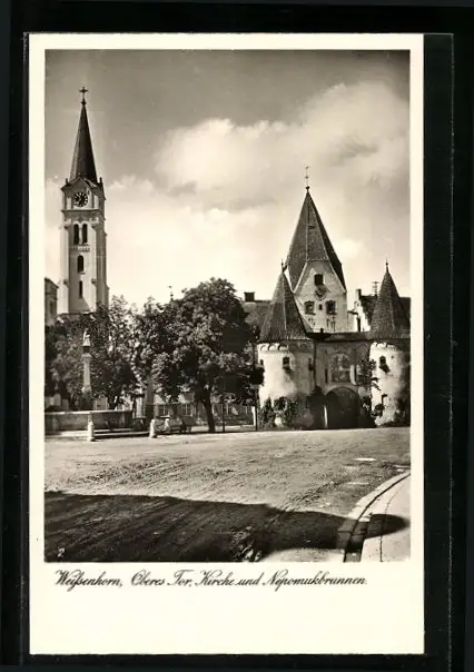 AK Weissenhorn, Oberes Tor, Kirche und Nepomukbrunnen