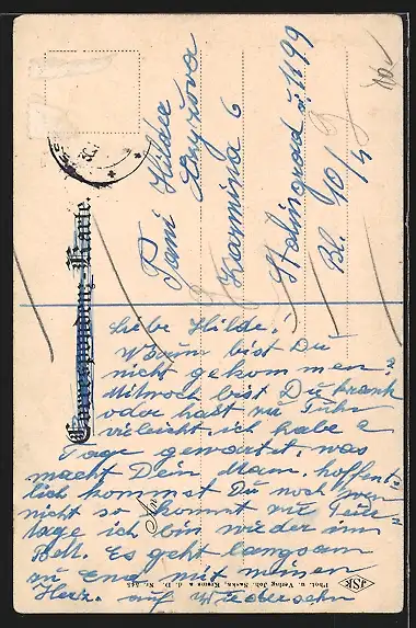 Personenbezogene Daten auf der Rückseite der Karte wurden durch blauen Textmarker unkenntlich gemacht. Die blauen Stellen sind auf die Vorderseite durchgeweicht und wirken sich negativ auf das Postkartenfoto aus
