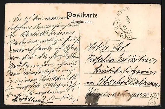 Personenbezogene Daten auf der Rückseite der Karte wurden durch blauen Textmarker unkenntlich gemacht. Die blauen Stellen sind auf die Vorderseite durchgeweicht und wirken sich negativ auf das Postkartenfoto aus
