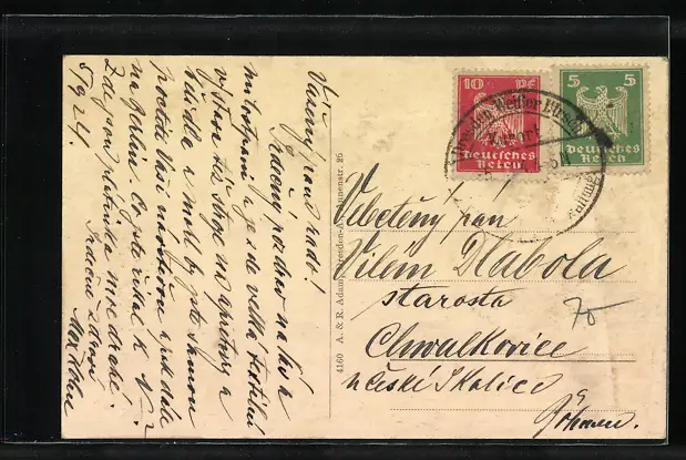 Personenbezogene Daten auf der Rückseite der Karte wurden durch blauen Textmarker unkenntlich gemacht. Die blauen Stellen sind auf die Vorderseite durchgeweicht und wirken sich negativ auf das Postkartenfoto aus
