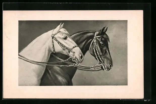 AK Weisses und dunkles Reitpferd mit Geschirr