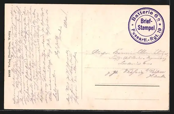 Personenbezogene Daten auf der Rückseite der Karte wurden durch blauen Textmarker unkenntlich gemacht. Die blauen Stellen sind auf die Vorderseite durchgeweicht und wirken sich negativ auf das Postkartenfoto aus