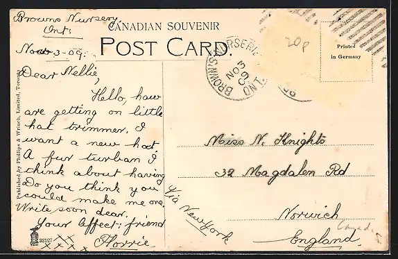 gelaufen 1909, Briefmarke entfernt, guter Zustand