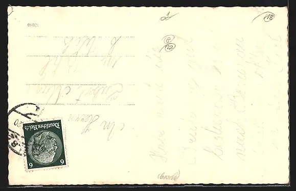 Personenbezogene Daten auf der Rückseite der Karte wurden durch blauen Textmarker unkenntlich gemacht. Die blauen Stellen sind auf die Vorderseite durchgeweicht und wirken sich negativ auf das Postkartenfoto aus