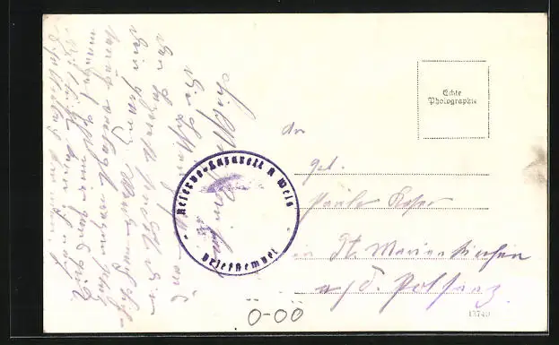 Personenbezogene Daten auf der Rückseite der Karte wurden durch blauen Textmarker unkenntlich gemacht. Die blauen Stellen sind auf die Vorderseite durchgeweicht und wirken sich negativ auf das Postkartenfoto aus