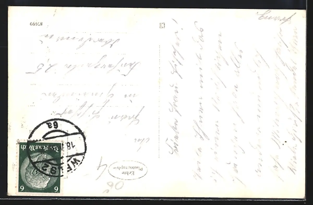 Personenbezogene Daten auf der Rückseite der Karte wurden durch blauen Textmarker unkenntlich gemacht. Die blauen Stellen sind auf die Vorderseite durchgeweicht und wirken sich negativ auf das Postkartenfoto aus