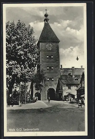 AK Wels /O. Ö., Strassenpartie am Ledererturm