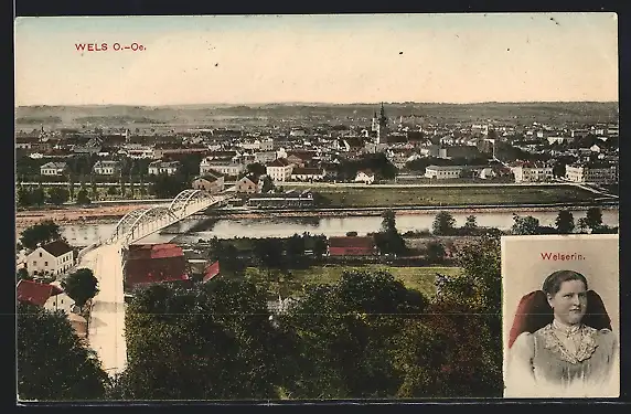 AK Wels /O.Oe., Ortsansicht und Portrait Welserin