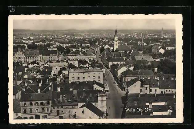 AK Wels /Ob.-Oe., Teilansicht mit Kirche und Strassenpartie