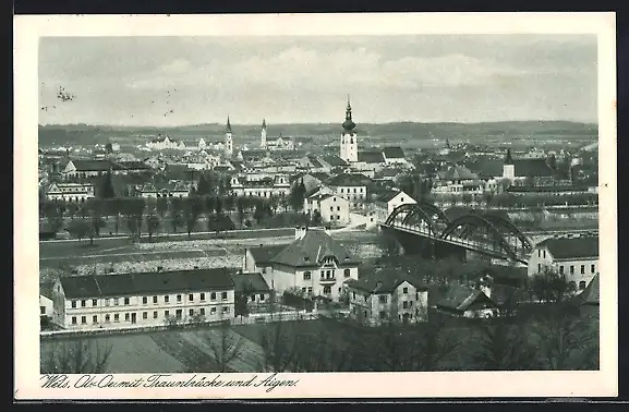 AK Wels, Ortsansicht mit Traunbrücke und Aigen