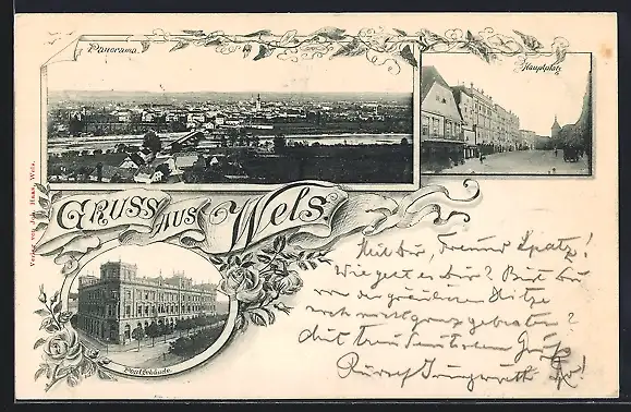 AK Wels, Panorama, Hauptplatz, Postgebäude