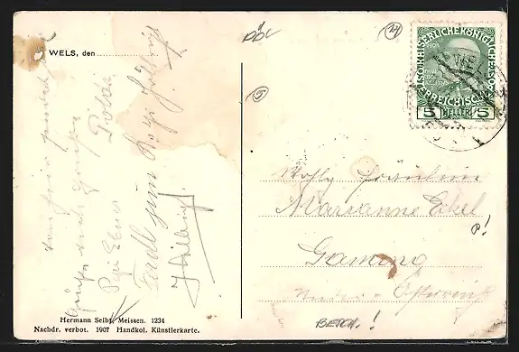 alte Ansichtskarte, gelaufen, rückseitig Klebe- und Papierreste, Eckknick unten li., Stempelspur, guter Zustand