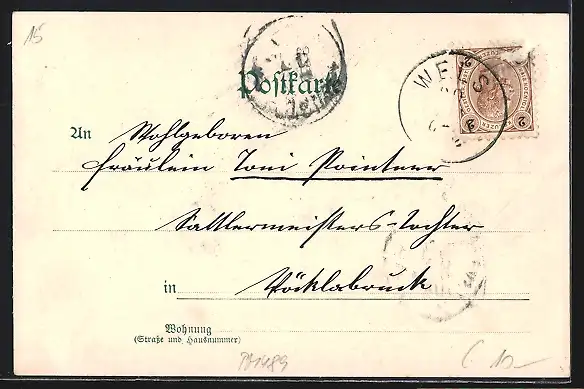 alte Ansichtskarte, gelaufen, Briefmarke entfernt, rückseitig Oberflächenschaden, Stempelspur, guter Zustand