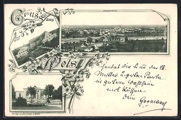 AK Wels, Volksgarten, Burg Wels und Panorama