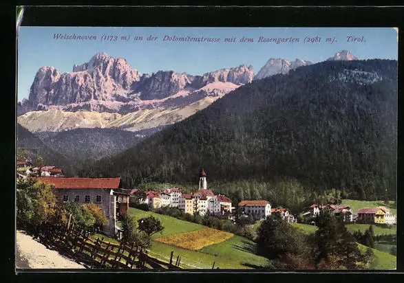 AK Welschnofen, Ortsansicht aus der Vogelschau, Blick zum Rosengarten