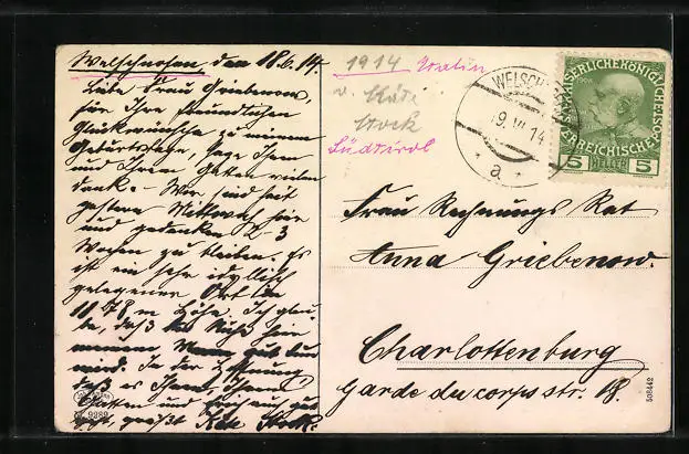 gelaufen 1914, Eckknicke unten, guter Zustand
