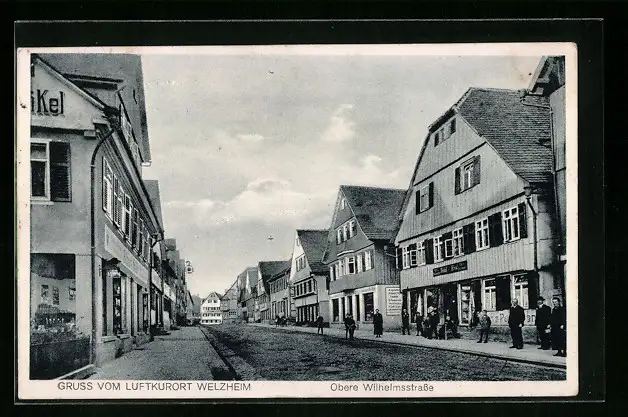 AK Welzheim, Obere Wilhelmsstrasse mit Geschäften
