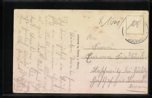 Personenbezogene Daten auf der Rückseite der Karte wurden durch blauen Textmarker unkenntlich gemacht. Die blauen Stellen sind auf die Vorderseite durchgeweicht und wirken sich negativ auf das Postkartenfoto aus